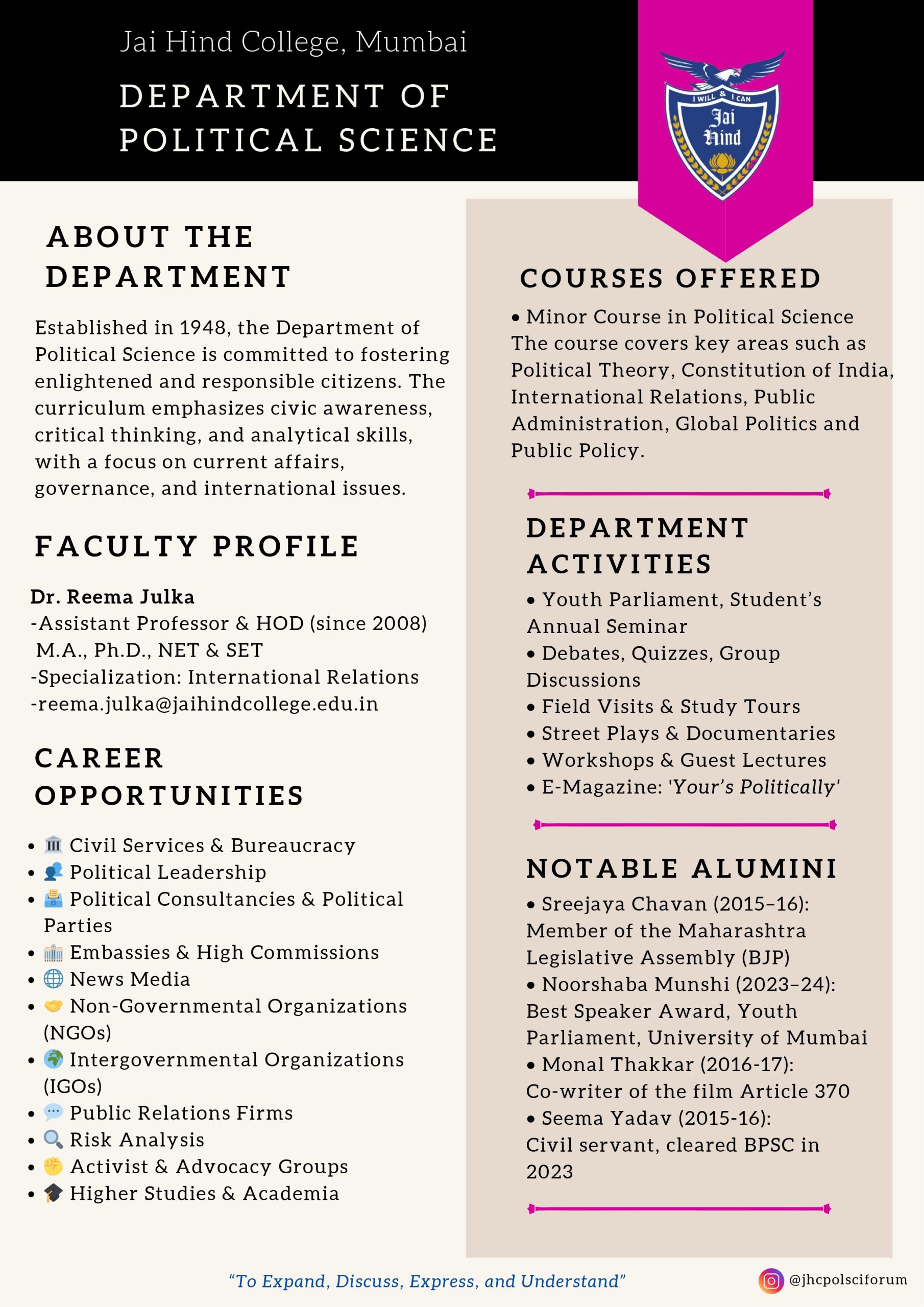 Political Science has been taught since the inception of the College in 1948. It has always been a popular subject among BA students. The motto of our department is to Expand, Discuss, Express and Understand’. Therefore, students are given ample opportunities not only to gain core knowledge of Political Science but also to develop critical thinking and analytical skills to reflect on national and international political issues and phenomena objectively. These innovative practices ultimately help students in preparing for various competitive exams such as UPSC, MPSC, CLAT, RBI, NET, SET, and many others.